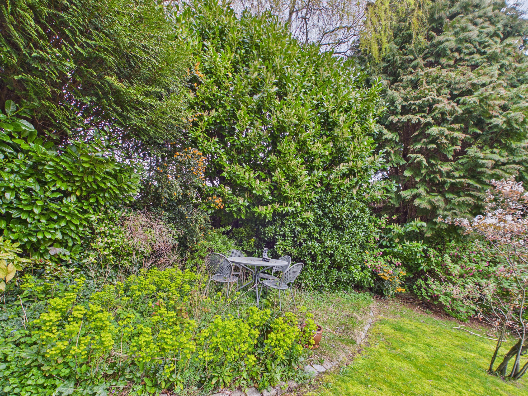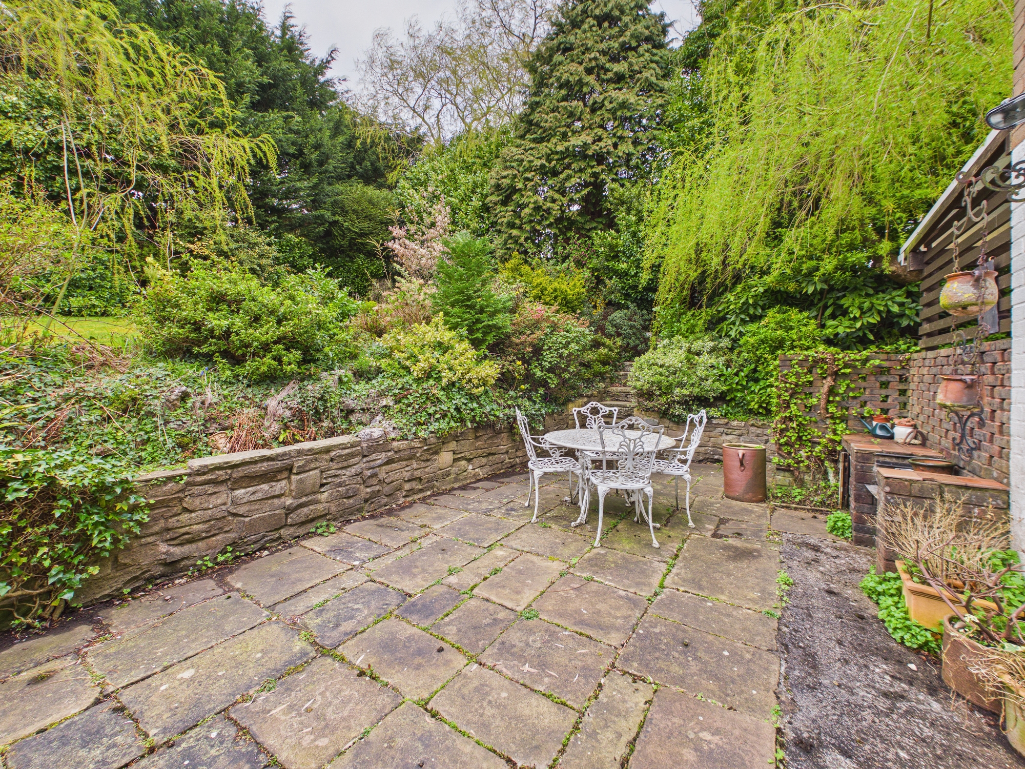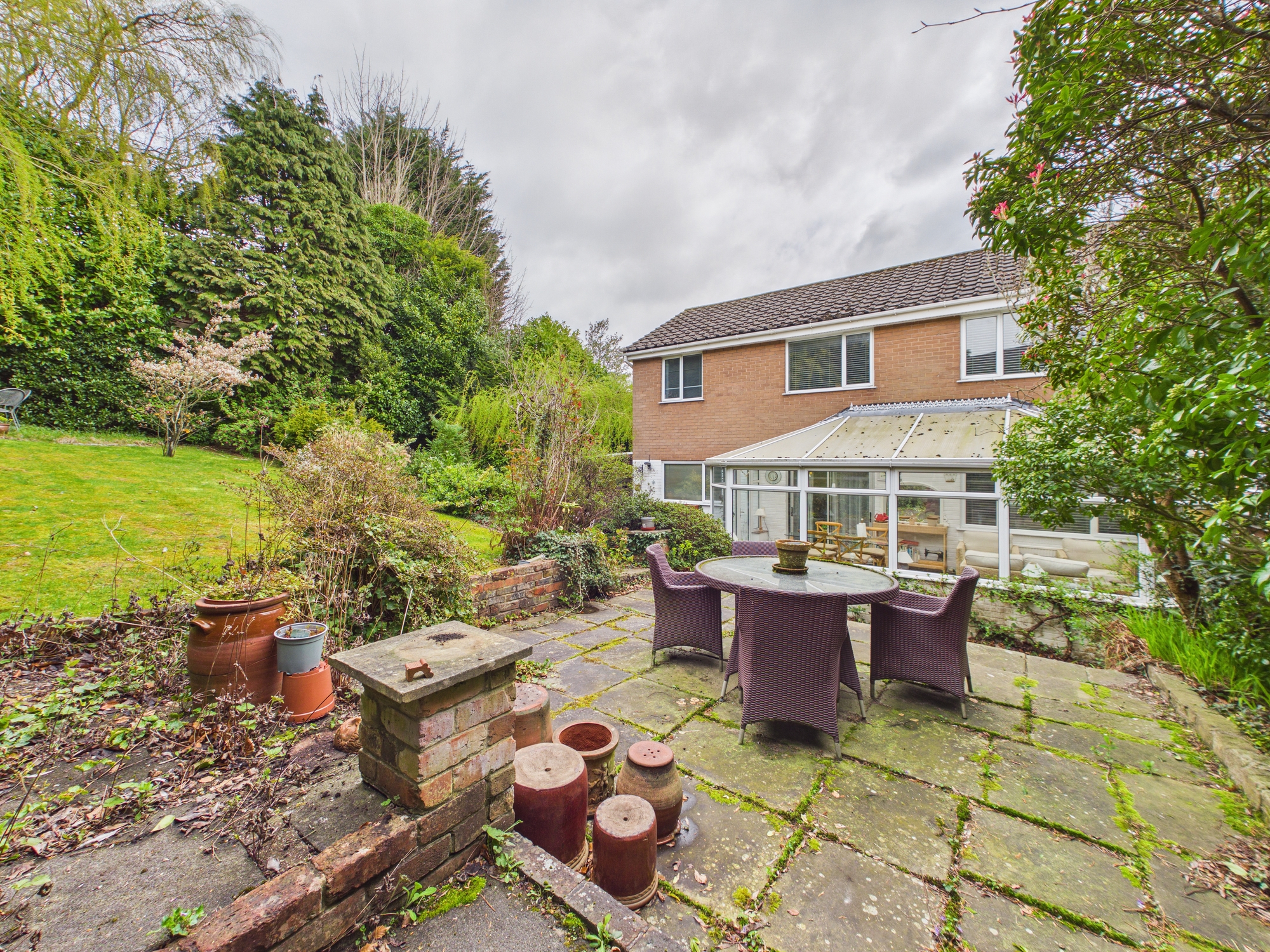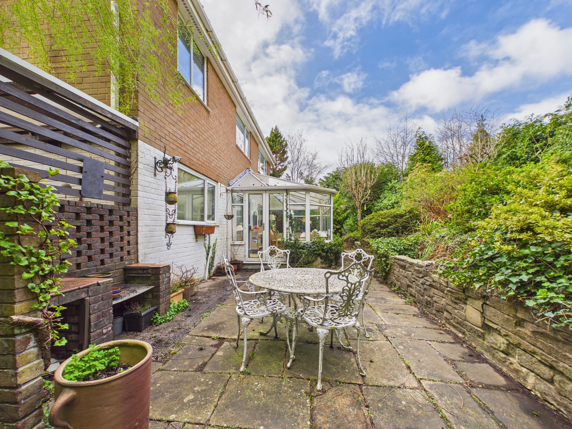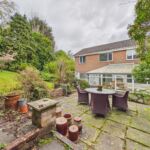 To the rear of the property, a substantial conservatory offers an additional reception area, flooded with natural light and providing the perfect place to relax while enjoying views over the garden. The rear garden itself is a true highlight, having been thoughtfully arranged to create a private and tranquil haven. With a number of patio areas, it is perfectly suited for outdoor dining, entertaining, or simply unwinding in a peaceful setting, and benefits from not being overlooked, enhancing the sense of privacy.