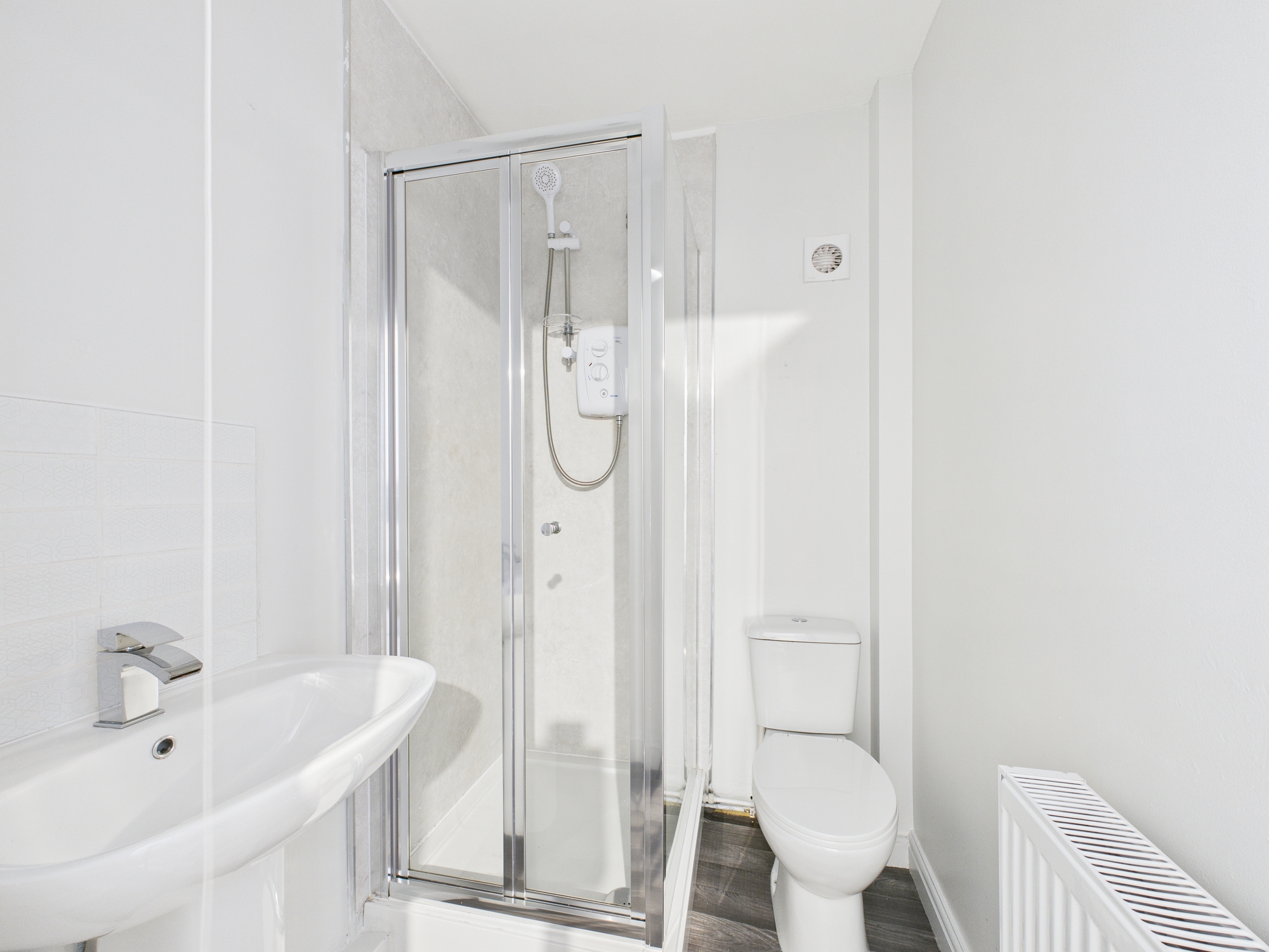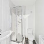 The bedroom is well-proportioned and finished in neutral décor, creating a clean and comfortable space. The property also features a stylish walk-in shower room, fitted with modern fixtures and finished to a high standard.