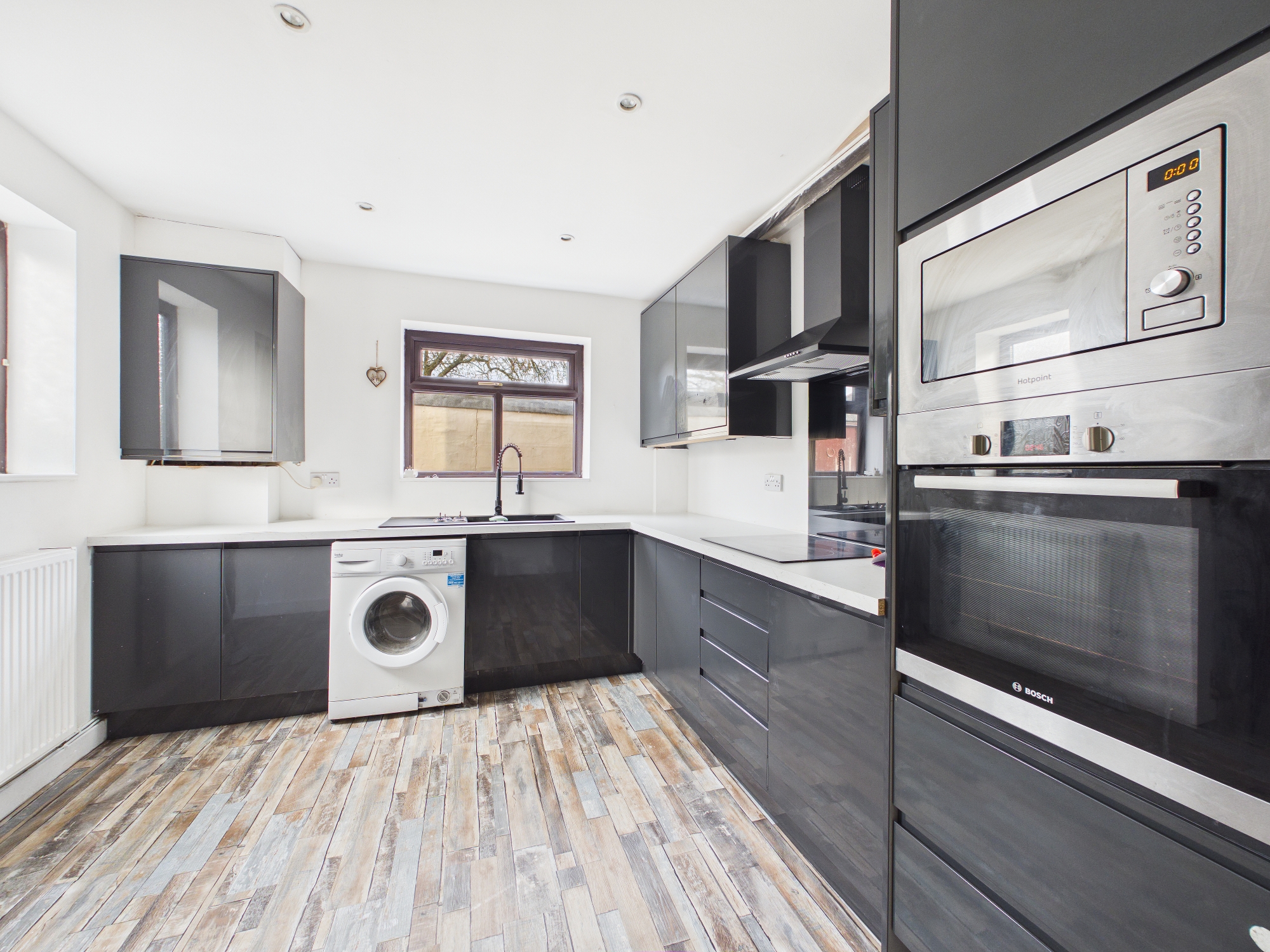 To the rear of the property is a spacious, modern fitted kitchen, thoughtfully designed with ample wall and base units providing excellent storage. The kitchen is equipped with integrated appliances, including a built-in oven and microwave, and offers plenty of worktop space, making it both practical and stylish for everyday use.